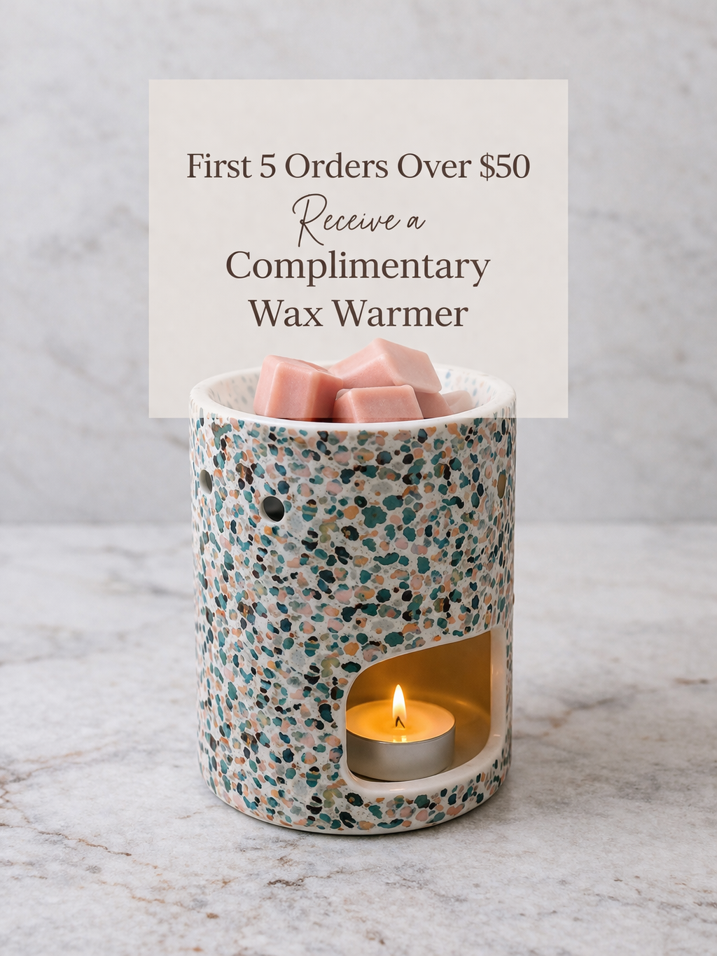 The first 5 orders over $50 will receive a complimentary wax warmer the perfect addition to your scent collection.